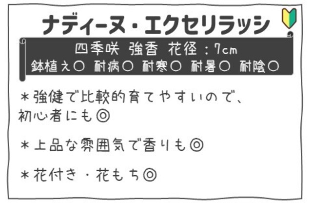 商品名:ナディーヌ・エクセリラッシ 心を惹きつける優雅さと豊かな香りが特徴のバラです! この「ナディーヌ・エクセリラッシ」は、洗練された色合いと魅力的な花びらが、あなたの庭や鉢植えに特別な雰囲気をプラスします。春から秋にかけて咲き誇る花々は、見る人の心を癒し、素晴らしい瞬間を演出します。 樹形は直立性で、力強い存在感を持ちながらも、コンパクトで扱いやすいのが魅力です。ボーダー花壇やコンテナガーデンにぴったりで、優雅な香りが周囲に心地よい空気を運ぶため、特別な時間を演出してくれます。 育てやすさも見逃せないポイントで、堅牢な品種のため、ガーデニング初心者の方でも安心してお選びいただけます。この美しいバラは、どんな庭でも愛らしい存在になることでしょう。 心を惹きつける花と香りを体験したい方にぜひお勧めしたいのが、ナディーヌ・エクセリラッシです。 ●メーカー:ドミニクマサド ●樹高:0.8m×0.8m ●樹形:直立性 ●咲き方:ロゼット咲 ●トゲ:少なめ