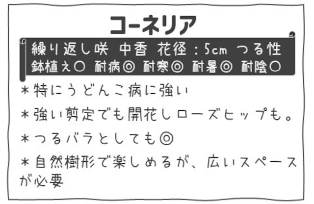 商品名:コーネリア 心を惹きつける優しい色合いと芳しい香りが特徴のバラです! この「コーネリア」は、繊細な花びらと美しい花形が魅力で、あなたの庭や鉢植えに温かな彩りを添えます。春から秋にかけて咲き続ける花々は、見る人の心に安らぎをもたらし、特別な瞬間を演出します。 樹形は直立性で、しっかりとした存在感を持ちながらも、扱いやすさが特徴です。ボーダー花壇やコンテナガーデンに最適で、豊かな香りが周囲を包み込み、特別な雰囲気を創り出します。 育てやすさも見逃せないポイントで、強靭な品種のため、ガーデニング初心者の方でも安心してお選びいただけます。この美しいバラは、どのような庭でも優雅な存在になることでしょう。 心を惹きつける花と香りを体験したい方にぜひお勧めしたいのが、コーネリアです。 ●系統:CL ●樹高:2m×2m ●樹形:直立性 ●咲き方:丸弁八重咲 ●トゲ:普通 ※つる性のバラとは枝が長く伸びる性質のバラです。アサガオのようにつるが自分で絡みついて登っていくのではなく、枝が長く伸びるだけなので、アーチやオベリスクなどの構造物に人の手で誘引してあげる必要があります。立体的な景観を楽しむのにお勧めです。