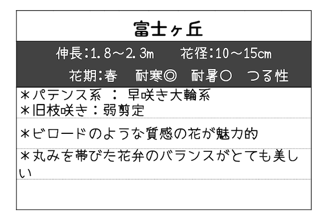 商品名:富士ヶ丘 「クレマチス 富士ヶ丘(Clematis ‘Fujigaoka’)」は、濃紫色の美しい半八重咲き大輪花が庭を上品に彩る日本育成のオリジナルクレマチスです。鮮やかな深い紫色の花弁と、黄色〜クリーム色の花芯とのコントラストが美しく、フェンスやトレリス、アーチ仕立てのアクセントに最適な品種となっています。 本品種はつる性で樹勢がしっかりしており、支柱やラティスに絡ませることで立体的なガーデン装飾が楽しめます。花は上向き〜やや外向きに咲き、花つきが良いため、庭の風景を華やかに演出します。濃色の花色は落ち着いた雰囲気を持ち、和風・洋風どちらの庭にも合わせやすいのが魅力です。 性質は比較的強健で、日本の気候にも合わせやすく、日当たりの良い場所と水はけの良い土で育てると元気に生育します。濃紫の大輪花は庭づくりの主役やギフト植物としてもおすすめです。 ●系統:パテンス系 ●花径:10cm〜15cm ●樹高:1.8m〜2.3m ●樹形:つる性 ●花期:春(北海道地方) ●剪定:弱