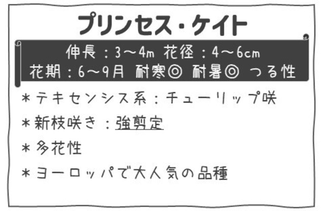 商品説明文:プリンセス・ケイト(Tx) 清楚で優雅な淡いローズピンク〜ピンクの花色が印象的なクレマチス「プリンセス・ケイト」。 花は中〜大輪(約8〜12cm前後)のロゼット咲き〜八重咲きで、庭やフェンス、トレリスを華やかに彩る人気品種です。 本種はつる性の多年草で、蔓(つる)はしなやかに伸び、支柱・フェンス・アーチ・トレリスへの誘引仕立てに向きます。 草丈はおよそ 2〜3m程度 まで誘引仕立てが可能で、立体的なガーデン演出に適しています。 花付きが良く、主な開花は春〜初夏ですが、環境や剪定の仕方によっては秋にも返り咲きすることがあります。 淡く上品な花色はナチュラルガーデンや寄せ植えにもよく馴染み、他の草花との組み合わせもしやすい品種です。 旧枝・新枝咲きで、軽い剪定を行うことで花付きと株形を整えられます。 耐寒性があり、日向〜半日陰まで育てやすい性質です。 ●系統:テキセンシス系 ●花径:4cm~6cm ●樹高:3m~4m ●樹形:つる性 ●花期:6〜9月(北海道地方) ●剪定:強