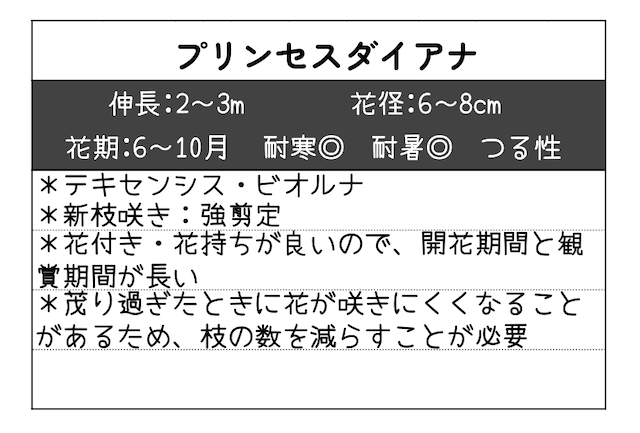 商品名:プリンセスダイアナ 「プリンセス・ダイアナ」は、上品で華やかなピンク〜ローズ系の花を咲かせる人気のクレマチスです。花色はやわらかく豊かな色調で、フェンスやトレリス、オベリスクに誘引すると、庭に華やかさと気品を添えます。 咲き方や性質については園芸界でも広く扱われているスタンダードな性質を持ち、栽培管理が比較的扱いやすい品種として知られています。 咲き方は新枝咲き。 その年に伸びた枝(新枝)に花芽を付け、春〜初秋(6〜10月頃)まで長く開花が楽しめます。 剪定は強剪定で管理するのが基本で、冬〜早春に地際近くまで切り戻すことで、翌年も新しい枝にしっかり花を咲かせます。 草丈(樹高)は 約2〜3m程度 に伸び、つるはしなやかに誘引できます。 日当たりは 日向〜明るい半日陰 が適し、植え付け時には 水はけの良い土壌 を用いると生育と花付きが安定します。 地植え・鉢植えどちらでも育てやすく、上品で優雅な大輪花を長く楽しみたい方におすすめです。 ●系統:テキセンシス・ビオルナ系 ●花径:6cm〜8cm ●樹高:2m〜3m ●樹形:つる性 ●花期:6月〜10月(北海道地方) ●剪定:強
