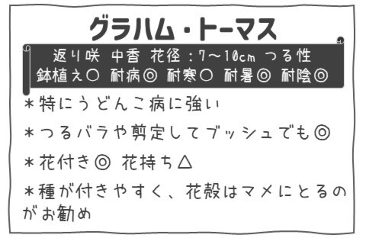 育てやすさも大きな魅力で、病気に強く、ガーデニング初心者の方にもお勧めです。華やかさと安心感を兼ね備えたグラハム・トーマスは、どのような庭でも美しく映えることでしょう。