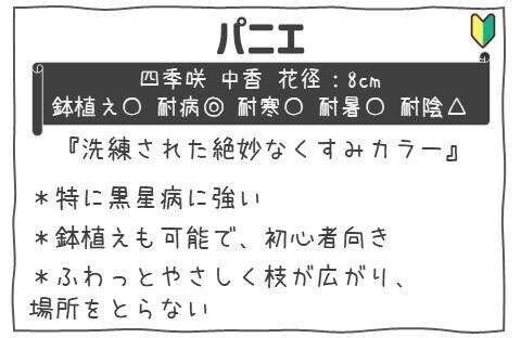 この「パニエ」は、華やかで繊細な花弁が見事に開き、あなたの庭や鉢植えに特別な魅力を添えます。春から秋にかけて、次々と咲き誇る花々は、見る人々の心に深い感動をもたらし、特別な瞬間を演出します。