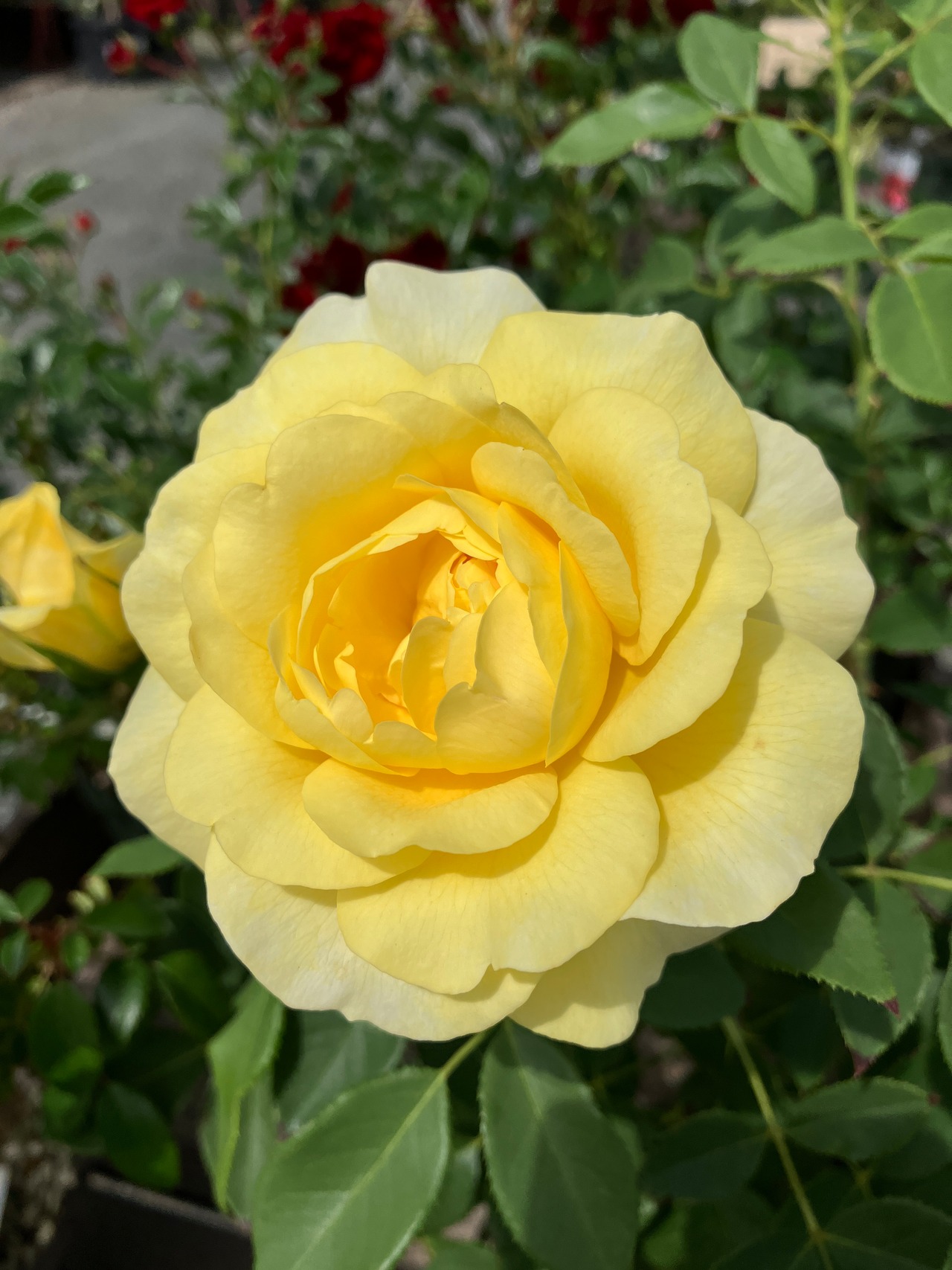 鮮やかなレモンイエローの大輪花を咲かせる、印象的なつるバラ「ライムライト・グランディローサ」。