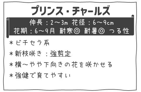 この品種はつる性の多年草で、フェンス・トレリス・アーチ仕立てなどへの誘引に適しています。