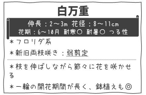 「白万重(しろまんえ)」は、純白〜白地の八重花が魅力の日本でも人気の高いクレマチス品種のひとつです。