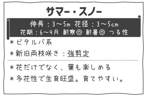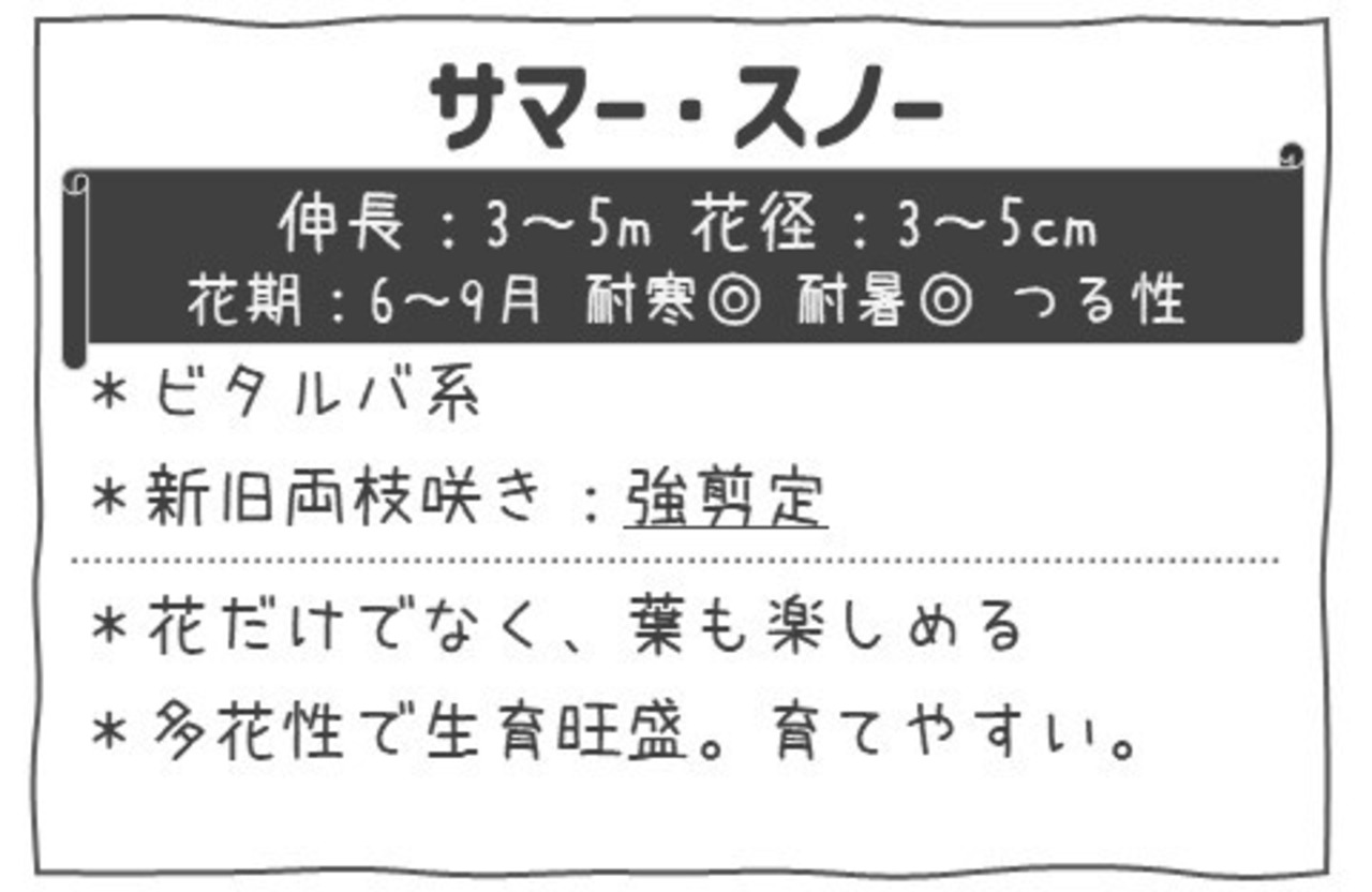 名前の通り、夏の庭でも雪が降り積もったように見えるほど、花付きがよく、春〜初夏の主花期に加え、盛夏〜秋まで繰り返し花を咲かせる返り咲き性が最大の魅力です。