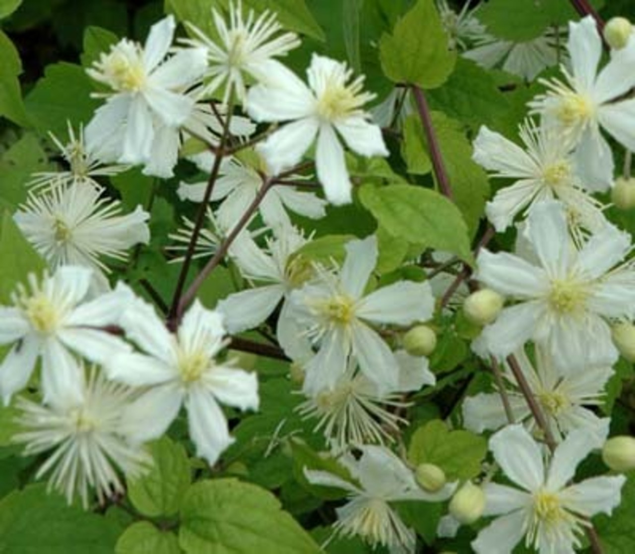 「サマー・スノー」は、清楚で軽やかな純白の小〜中輪花を枝いっぱいに咲かせるつる性クレマチスです。
