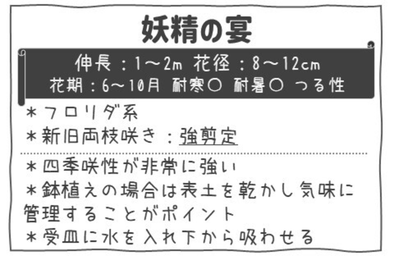 「妖精の宴」は、やさしいピンク〜ライトローズ色の小〜中輪花(約5〜8cm)が枝いっぱいに咲き、庭やフェンス、トレリス、オベリスクに誘引すると華やかな空間を演出します。