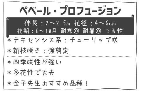 「ぺベール・プロフュージョン」は、明るいピンク〜ローズ系の中輪花(約5〜6cm)が枝先にびっしり咲く華やかなクレマチスです。
