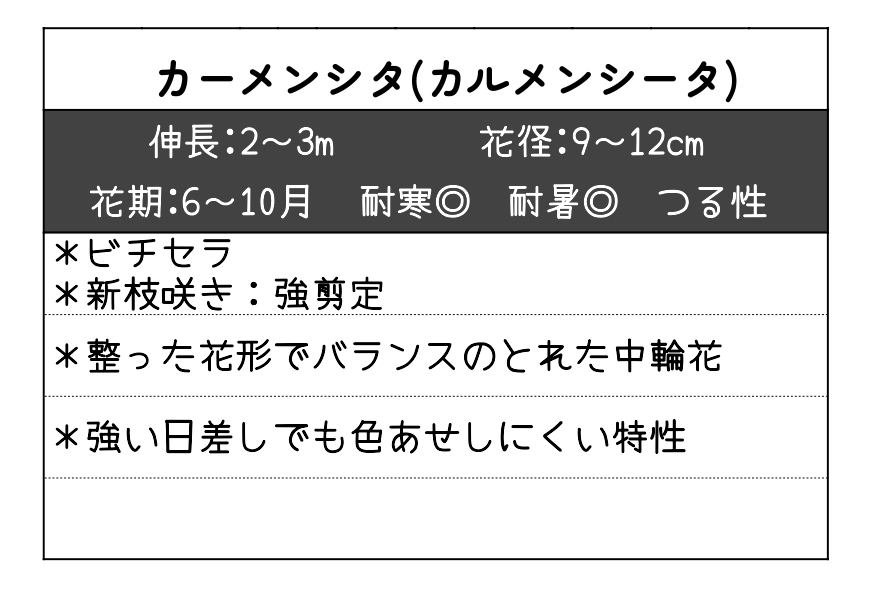 「カーメンシタ(カルメンシータ)」は、ビチセラ系(Viticella)に分類されるつる性クレマチスで、枝全体に大輪の花が咲き、夏〜秋まで長く楽しめる多花性品種です。