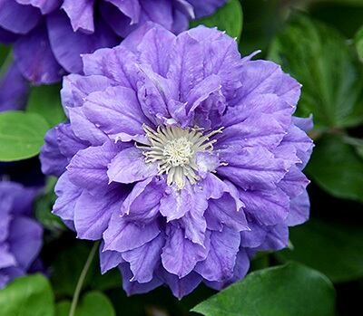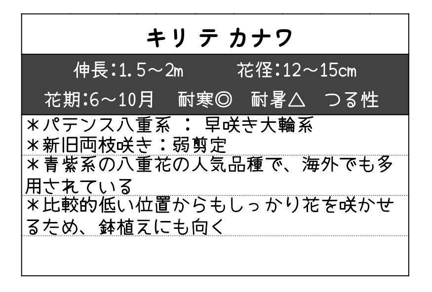 「キリ・テ・カナワ」は、パテンス系の八重咲き大輪クレマチスとして人気のある品種で、濃く鮮明な青紫色の花が庭を華やかに演出します。花は幾重にも波打つ花弁が重なり、存在感のある豪華な印象です。
