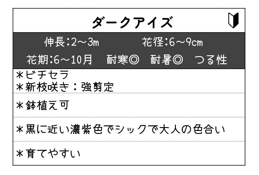 「ダークアイズ」は、濃紫〜黒紫の花色と花の中心に入る濃いアイカラーが印象的なクレマチスで、庭のアクセントとして人気のある品種です。