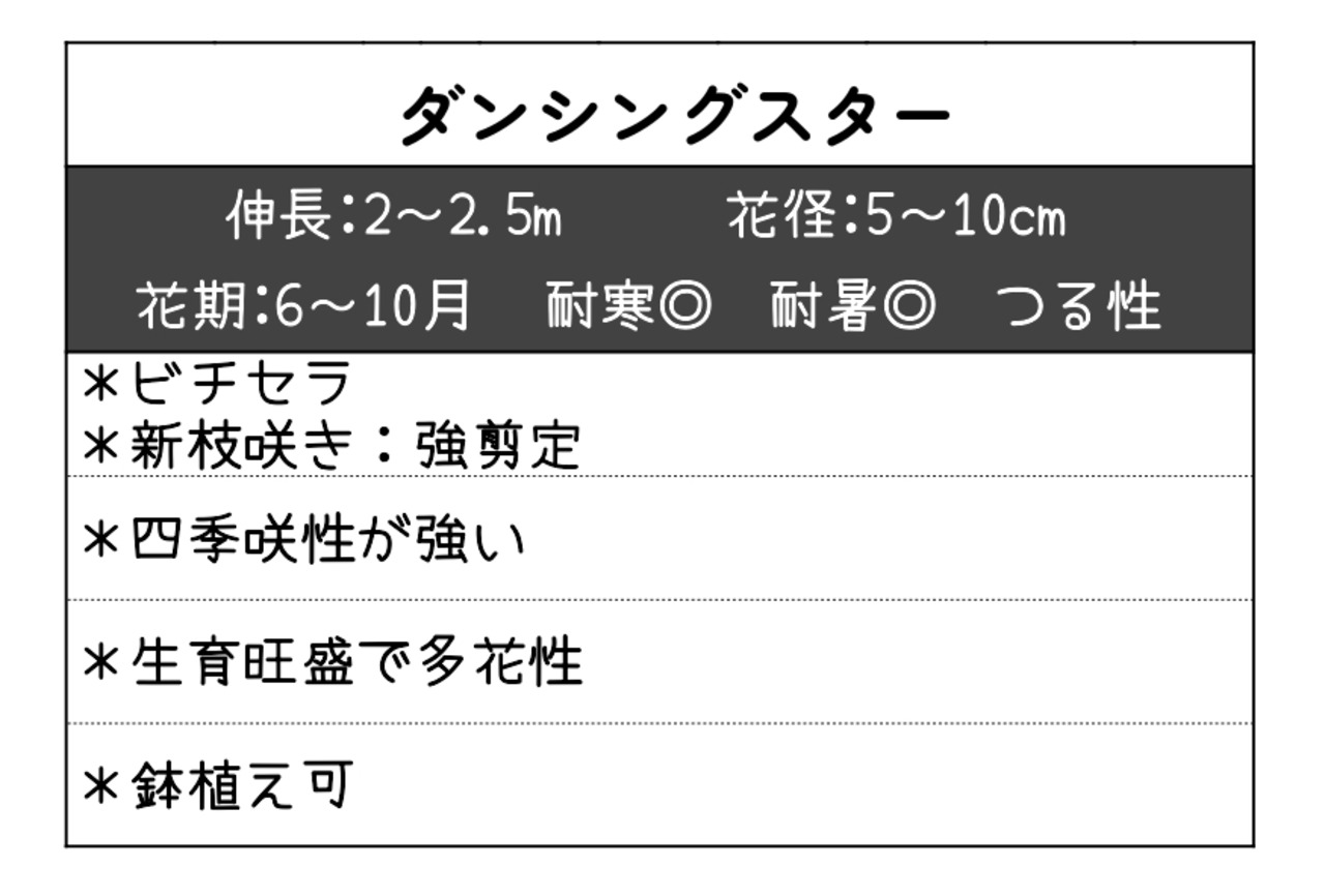 「ダンシングスター」は、花はビロードのような質感で、節々に次々と咲き、庭のアクセントとしてよく映えます。高貴でミステリアスな色合いが、フェンスやトレリス、オベリスクを華やかに彩ります。