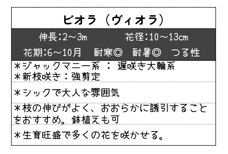 花弁はやや幅広く、節々にしっかり咲くため、フェンスやトレリス、オベリスクに誘引すると庭を豊かに彩ります。
