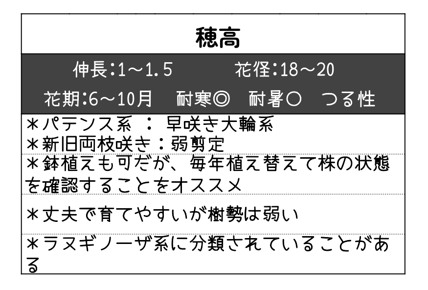 「穂高」は、魅力的な大輪の花(約18~20cm)が特徴のクレマチス品種です。花色は鮮やかな紫で、多層の花弁が生み出す壮麗な姿は、庭やフェンス、オベリスクに誘引することで、華やかさと奥行きを与えます。